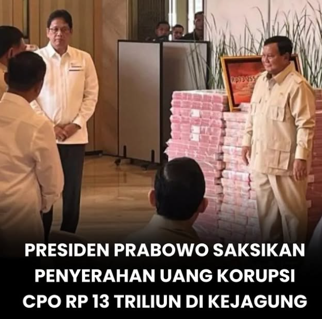 Presiden Republik Indonesia Prabowo Subianto menghadiri dan menyaksikan langsung penyerahan uang pengganti kerugian negara sebesar Rp13,2 triliun dalam perkara tindak pidana korupsi fasilitas ekspor minyak kelapa sawit (CPO) dan turunannya. Acara tersebut berlangsung di Kejaksaan Agung RI, Jakarta, pada Senin (20/10), menandai salah satu pengembalian kerugian negara terbesar dalam sejarah penegakan hukum Indonesia.